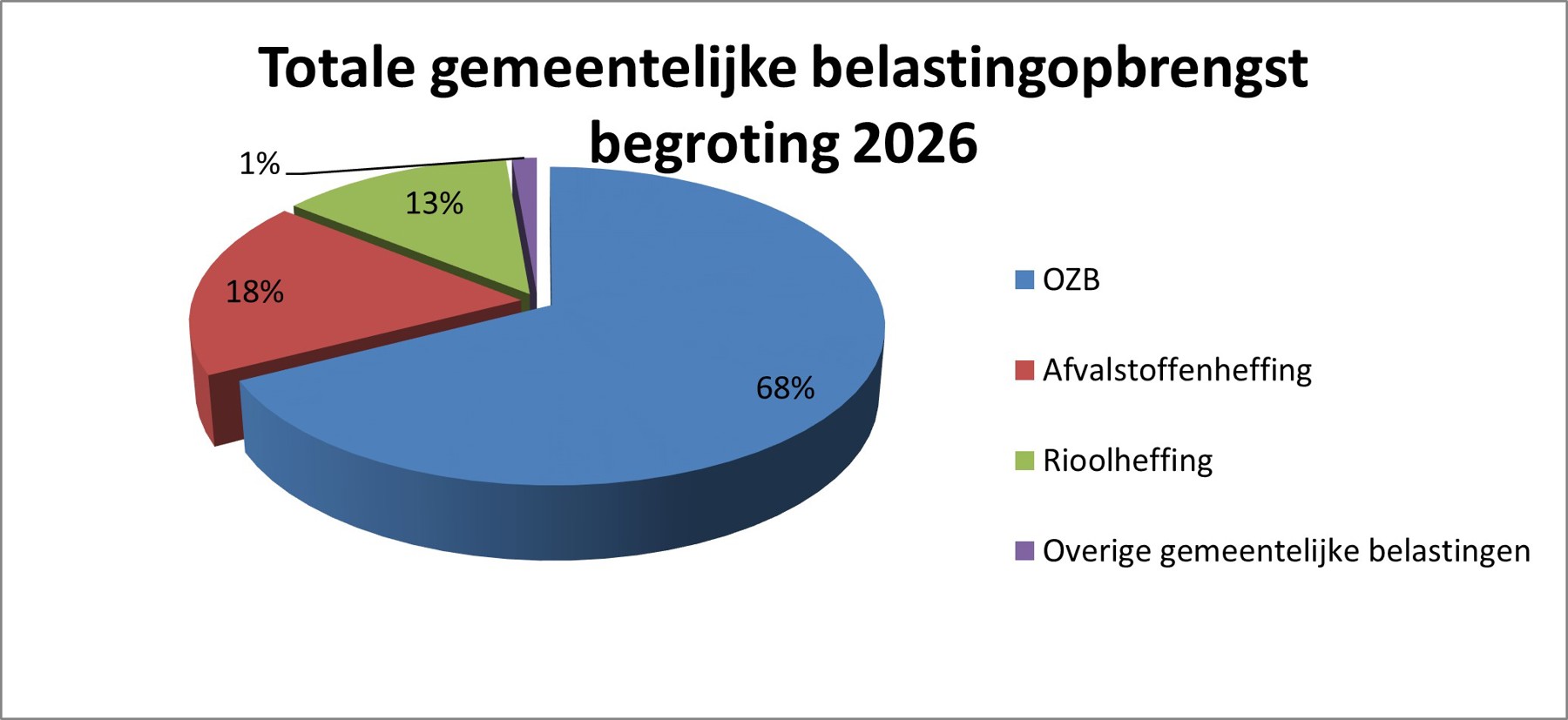 Onderstaand wordt een prognose van de opbrengst uit de algemene gemeentelijke belastingen en de afval- en rioolrechten weergegeven. De OZB-opbrengst wordt verhoogd met de algemene indexering van 2,22 %. Een bedrag van € 1,539 mln. wordt ingezet voor de verlichting van de OZB en hiervoor is een voorstel gemaakt als onderdeel van de belastingmaatregelen 2026. Er is geen rekening gehouden met wijzigingen in de WOZ-waarden. Op 15 oktober komt er een eerste prognose van de WOZ-waarden door de BsGW. Op 15 november kan een actualisatie van de prognose volgen. Deze kan nog een technische aanpassing van de tarieven in december betekenen.