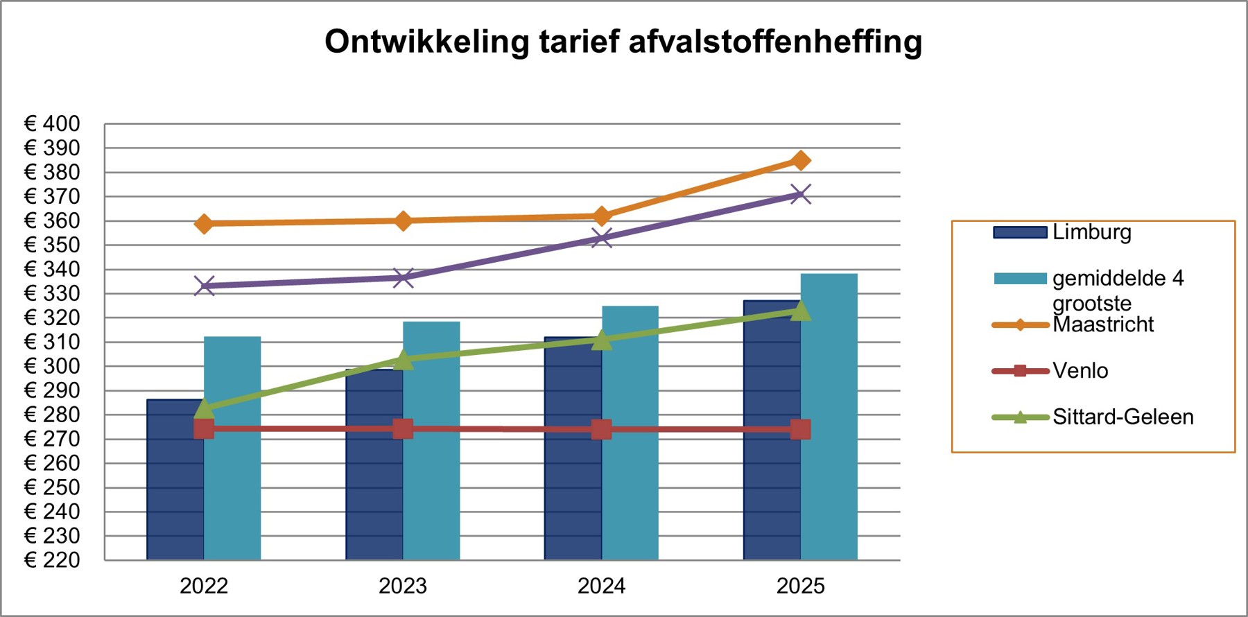Daarentegen betaalt een huurder van een woning in Sittard-Geleen alleen afvalstoffenheffing, hierdoor zijn we de goedkoopste gemeente van de 4 grote gemeenten in Limburg. Een gezin dat in een huurhuis woont, is ruim € 100 per jaar goedkoper uit in onze gemeente dan in het op de tweede plaats staande Maastricht.