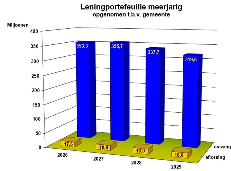 Het schuldrestant per 1 januari 2026 van de opgenomen leningen bedraagt € 358,8 mln. Hiervan betreft € 273 mln. Voor totaalfinanciering van de Gemeente, € 80,3 mln. Projectfinanciering en € 5,5 mln. zijn door verstrekte leningen. Het schuldrestant van de in het kader van de publieke taak uitgezette leningen bedraagt € 5,5 mln.