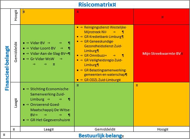 Het risicoprofiel van verbonden partijen wordt jaarlijks vastgesteld aan de hand van een risicomatrix. Via deze matrix worden de risico’s van verbonden partijen geclassificeerd op basis van zowel het financieel als het bestuurlijk belang. De uitgangspunten voor het opstellen van de risicomatrix zijn vastgelegd in de kadernota Verbonden Partijen.